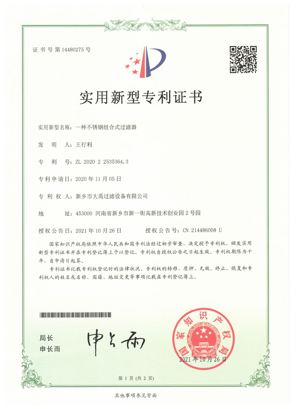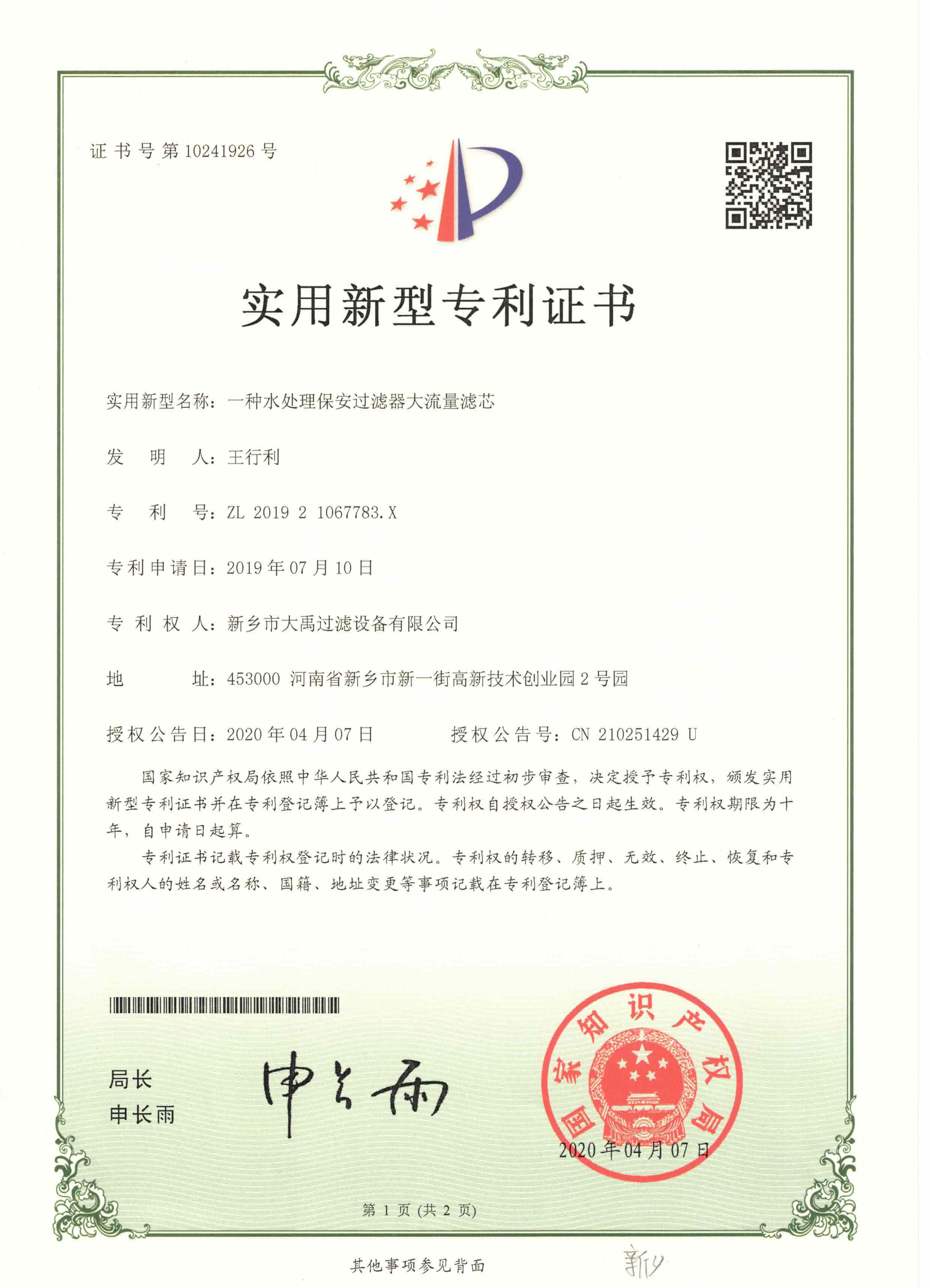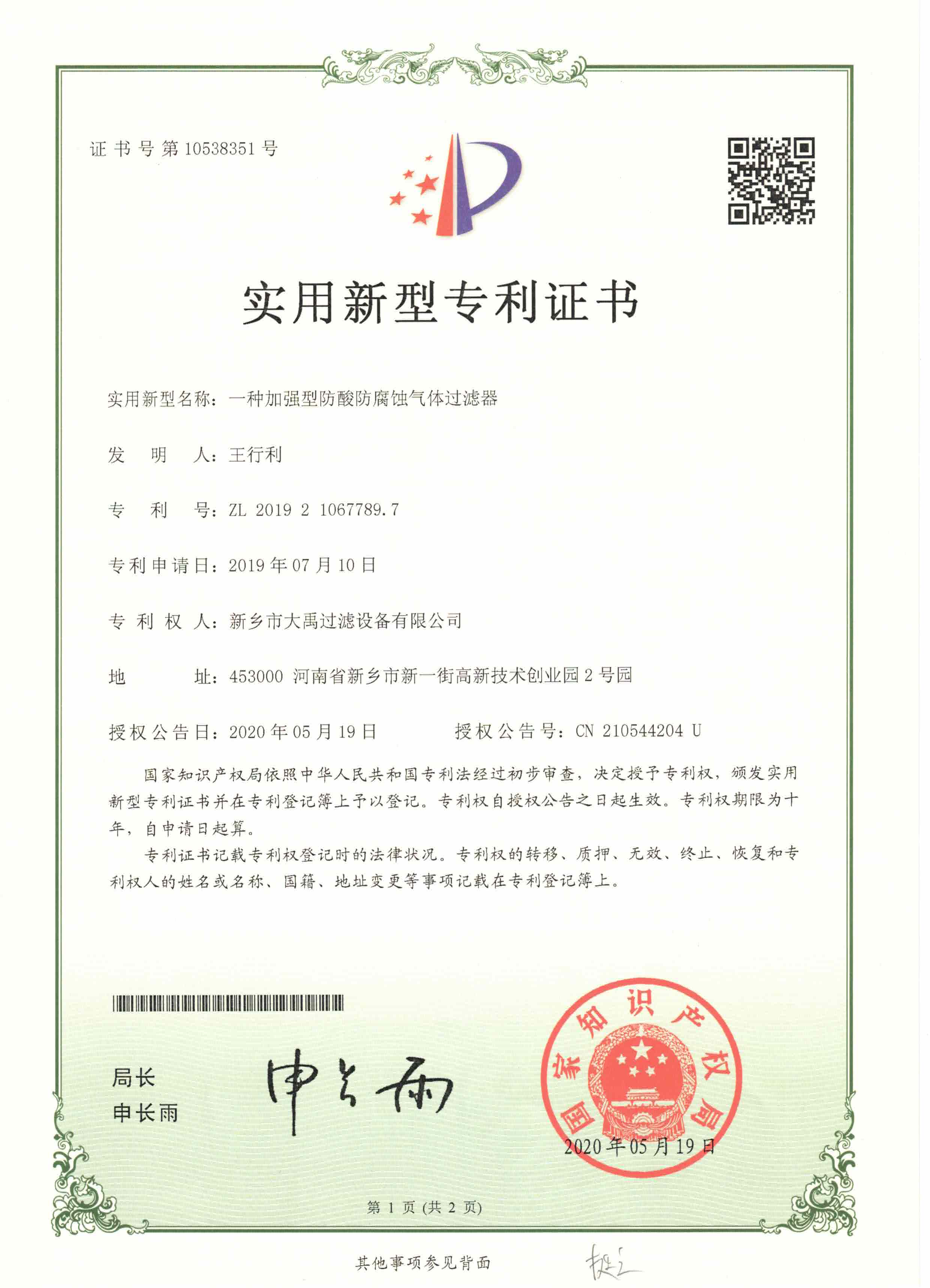 實(shí)用新型專利證書